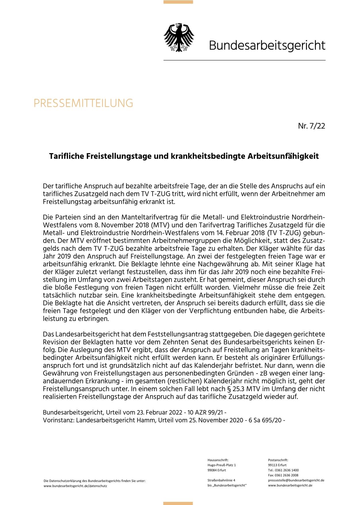 Das Bundesarbeitsgericht (BAG) hat am 23. Februar 2022 ein Urteil in der Frage „Was passiert, wenn man an einem geplanten T-ZUG Tag erkankt?“ gesprochen. In ihrem Urteil stellen die Richter fest, dass der Anspruch auf einen T-ZUG Tag nicht verfällt, wenn der Beschäftigte erkrankt ist. Stattdessen ist der Tag an einem anderen Tag nachzugewähren. Sollte das aus personenbedingten Gründen (z.B. wegen längerer Erkrankung) nicht im laufenden Kalenderjahr möglich sein, so hat der Beschäftigte dann Anspruch den Tag anteilig als T-ZUG Geld am Ende des Jahres ausbezahlt zu bekommen.