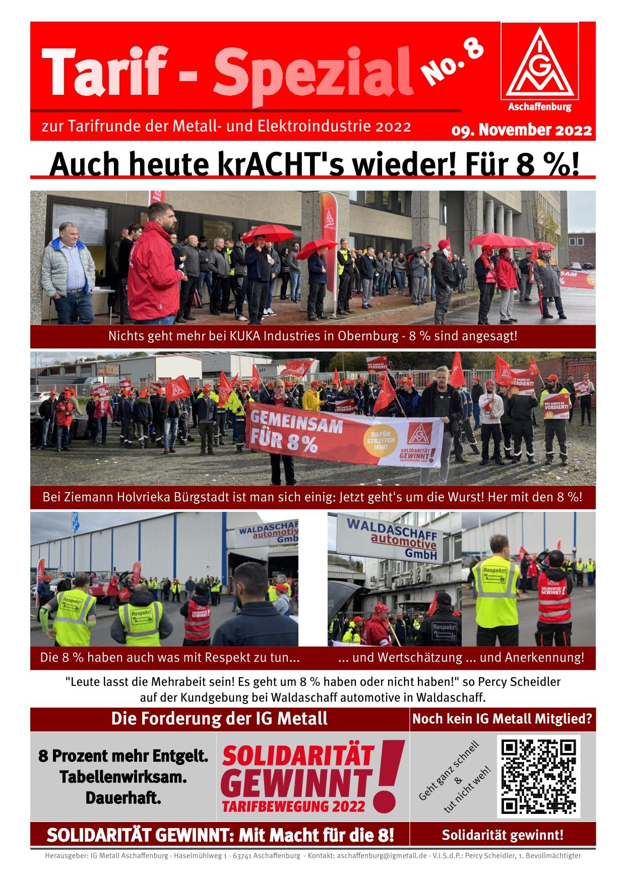Trotz schwieriger Lage im Betrieb haben sich viele Beschäftigte von KUKA Industries in Obernburg um 9 Uhr vor das Werk bewegt und sich stark gemacht für 8 %! Dem Angebot der Arbeitgeber haben sie eine klare Abfuhr erteilt!