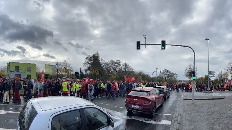 Der Demozug ging die Wailandtstraße entlang wo sich in der Wailandtstraße 13 die Beschäftigten von Linde Hydraulics anschlossen. Der über 1500 Menschen zählende Demonstrationszug folgte der Wailandtstraße bis auf die Großostheimer Straße. Auf dieser ging es dann bis zur Kreuzung Dr-Hans-Meinhardt-Allee wo der Demozug zum Haupteingang des Werks 2 einbog. Dort wurden die Warnstreikenden mit Musik und einer Verpflegungsstation empfangen.