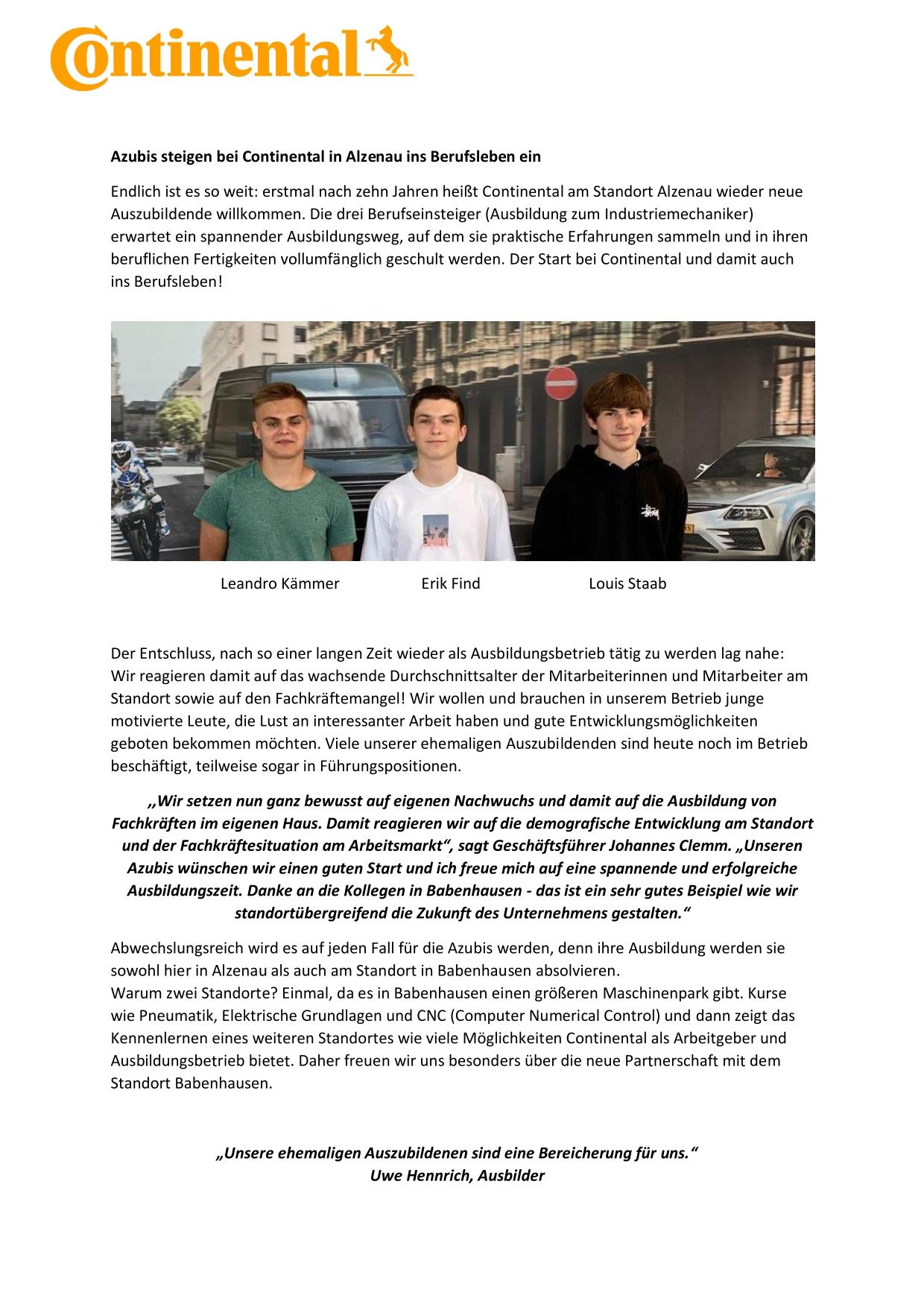 Zehn Jahre ist es her, dass die Ausbildung am Continental Standort in Alzenau eingestellt wurde. Nun konnten am 01.09.2022 wieder drei junge Menschen in Alzenau ins Berufsleben starten.